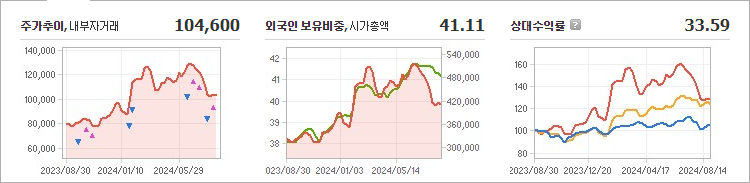 현재 기아의 주가는 104,600원으로, 전일 대비 6.69원이 하락한 상태입니다. 기아의 주주 현황을 살펴보면 현대자동차와 그 외 4인이 총 36.11%의 지분을 보유하고 있습니다. 기아는 자동차 제조업체로, 현재 주가는 104,600원입니다. 기아의 시가총액은 42조 5,849억 원이며, 발행된 주식 수는 399,858,417주입니다. 외국인 보유 비중은 41.11%에 달하며, 장중 거래량은 827,919주에 이릅니다. 기아의 매출액은 537,808억 원에 도달했습니다.